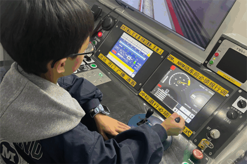 坐进1:1还原的地铁模拟驾驶舱,眼前是与真实列车一致的操纵台:驾驶手柄、指示灯阵列、前方的虚拟轨道场景……推动操作手柄,虚拟屏幕里的列车会同步启动,模拟加速、减速、过弯道、进站停车等全流程驾驶体验。