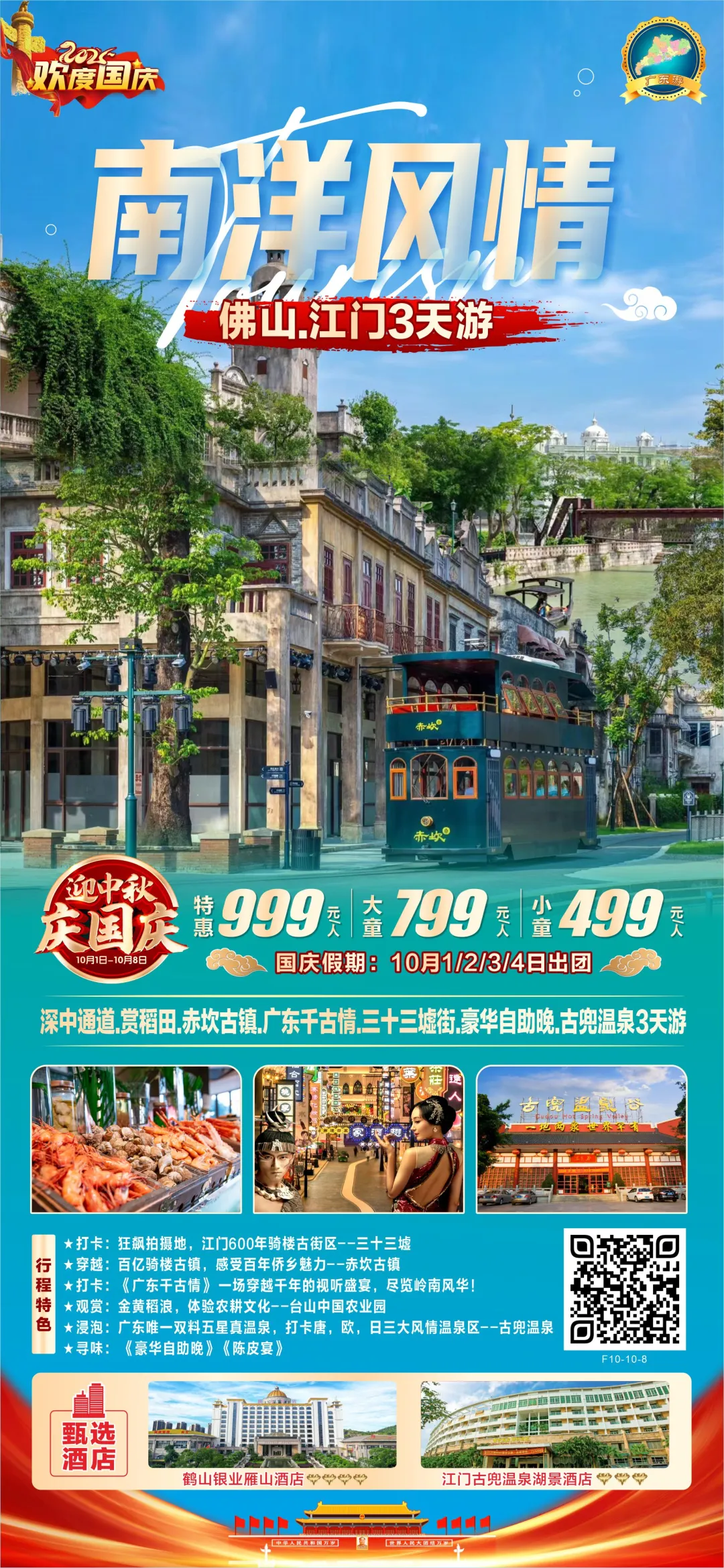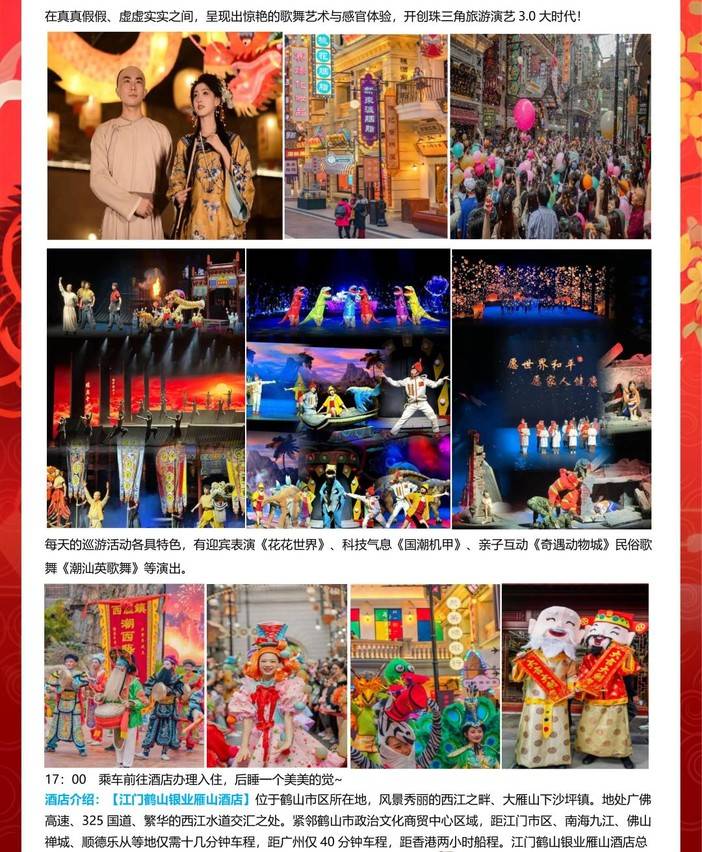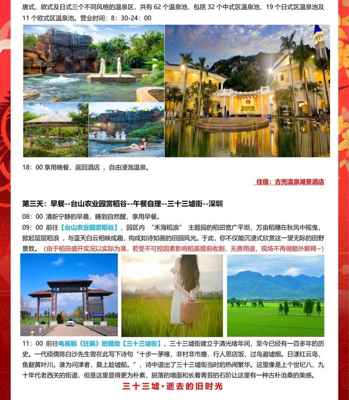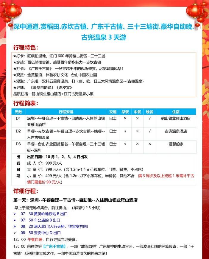 即将成团!国庆10.1-10.4每日出团【佛山.江门3天】赏稻田、赤坎古镇、广东千古情、三十三墟街、豪华自助、古兜温泉 [复制链接]