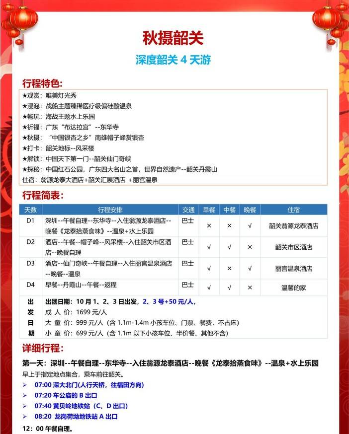 即将成团!国庆10.1-10.3每日出团【深度韶关4天】丹霞山、东华寺、南雄帽子峰赏银杏、风采楼 [复制链接]