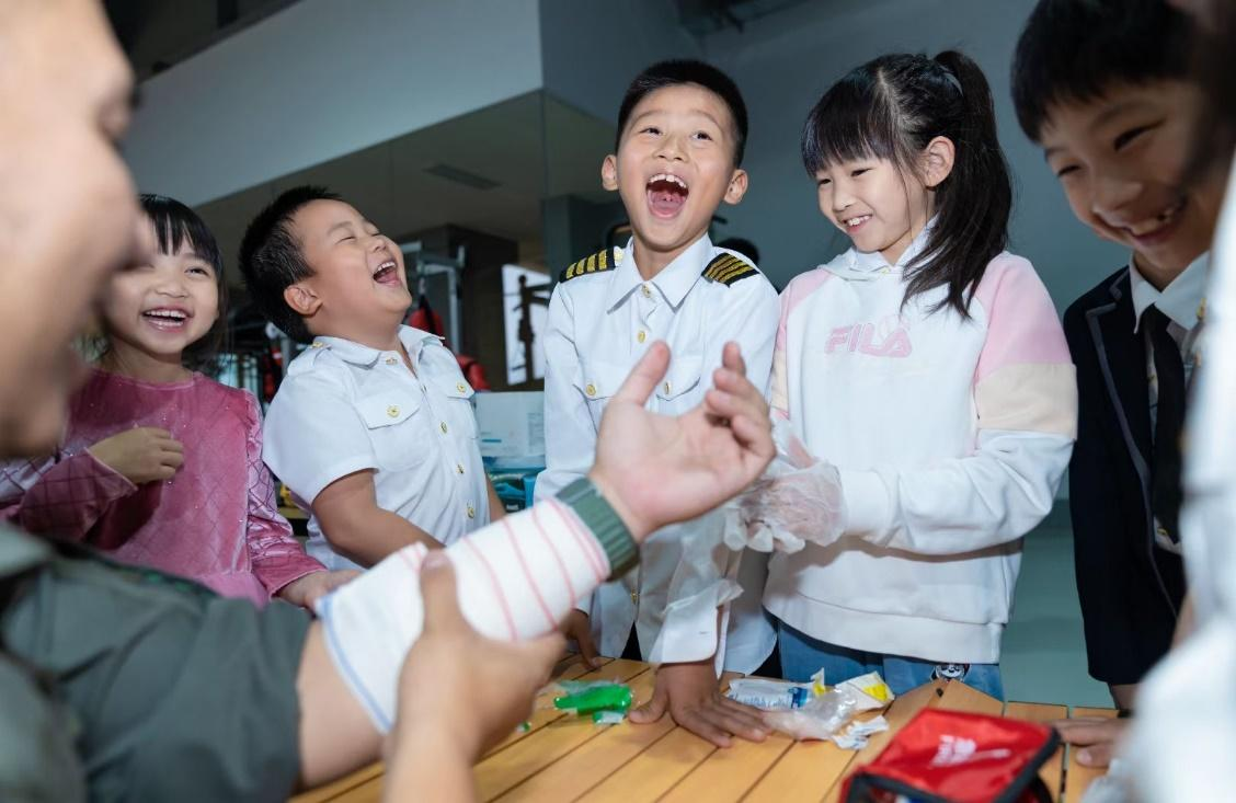 学员们能够近距离观察应援直升机,聆听应急救援员的讲解,了解直升机在实施搜索救援、伤员转运、空中指挥等工作应急任务中的应用。学习应急急救、止血包扎、通过简单实际操作的学习,教会孩子们在生活中遇到危险该如何自救、如何避免伤害的进一步加重。